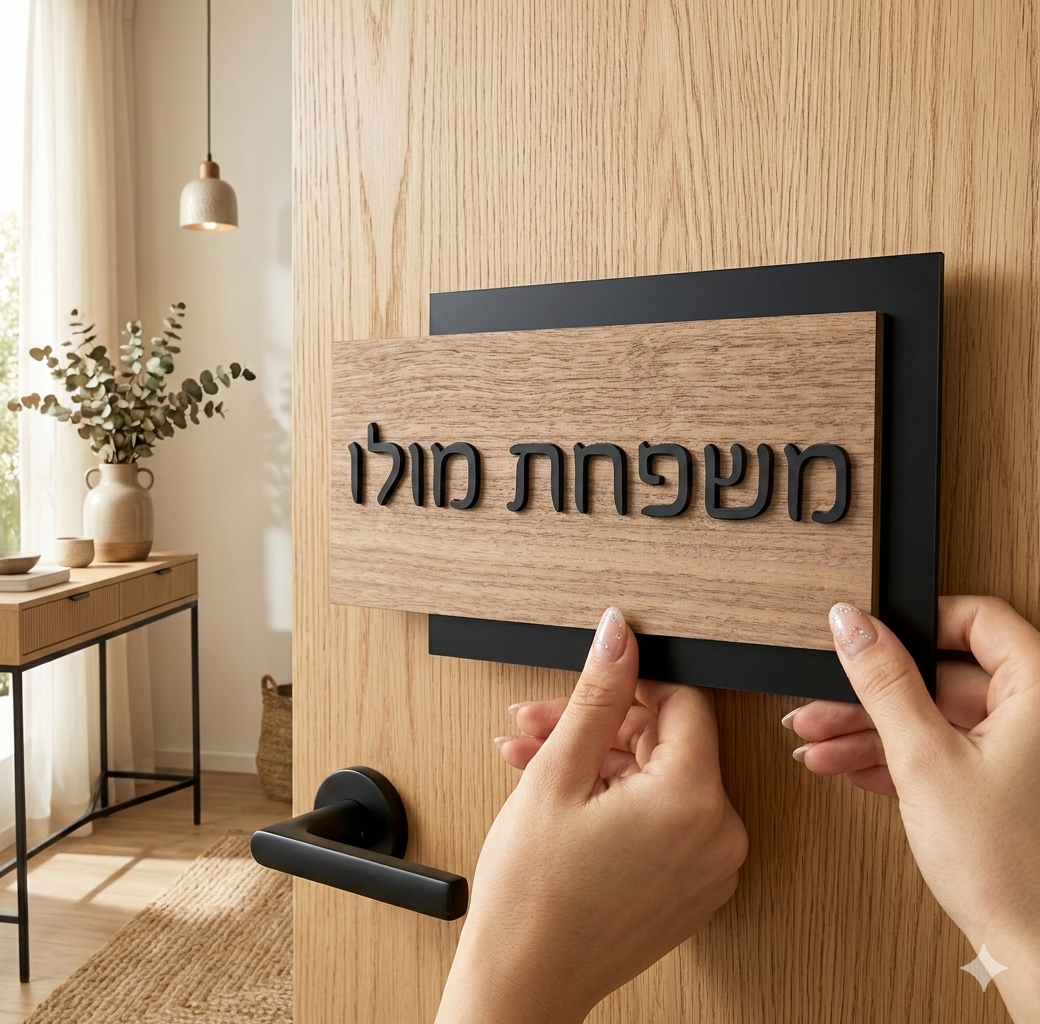 “הדפסנו לוגו משפחתי קטן בפינה – יצא מדויק בטירוף! המסגרת הדקה בשחור מט נותנת מראה נקי ויוקרתי לכניסה לבית.”