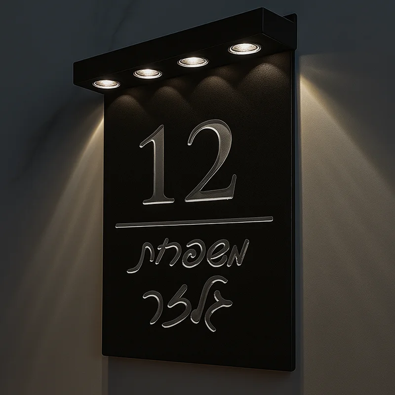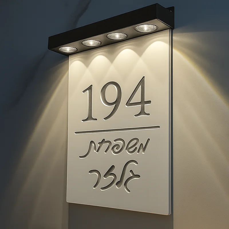 שלט מספר בית סולארי אקריל מואר – עיצוב עברי בהתאמה אישית