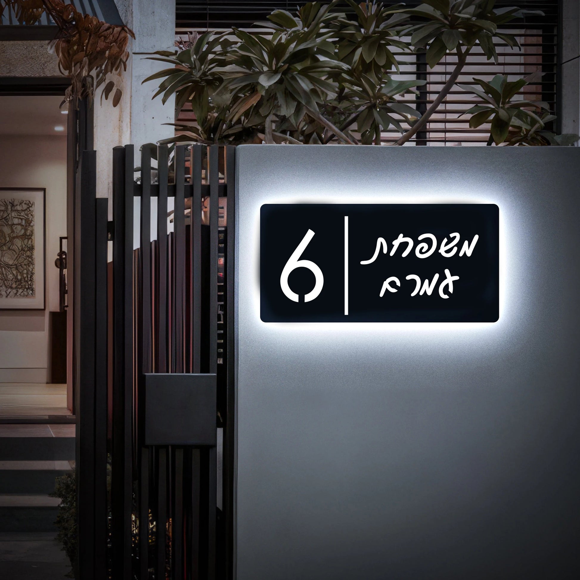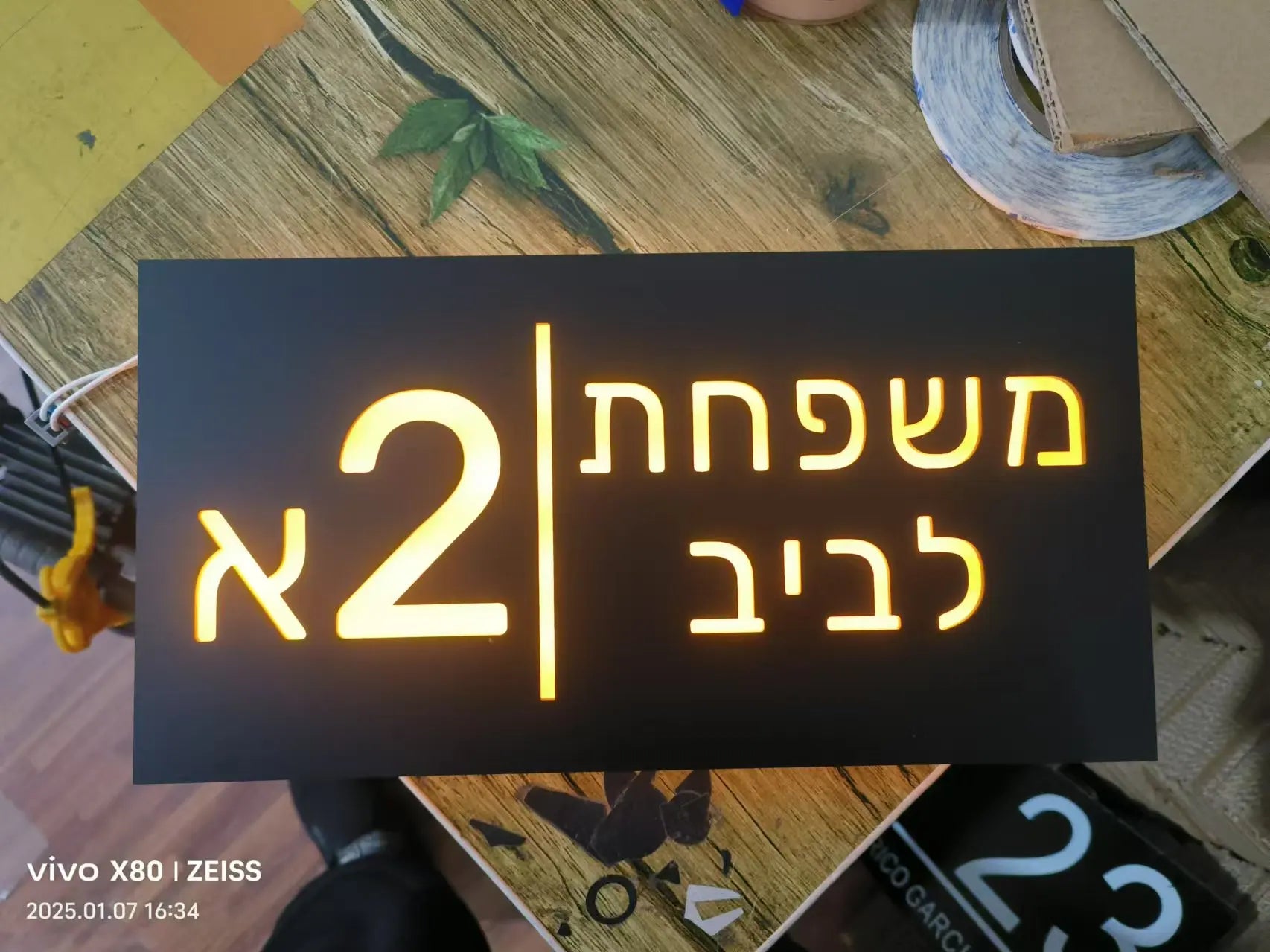 שלט LED משלב בסיס אקריל שחור יוקרתי, חזית מראה ותלת־ממד, ותאורת LED חמה שמאירה את מספר הבית והשם בצורה ברורה ואלגנטית. השלט מיוצר משכבה כפולה של אקריל איכותי (לא פלסטיק זול) עם חיתוך לייזר מדויק למראה מודרני ומרשים.
